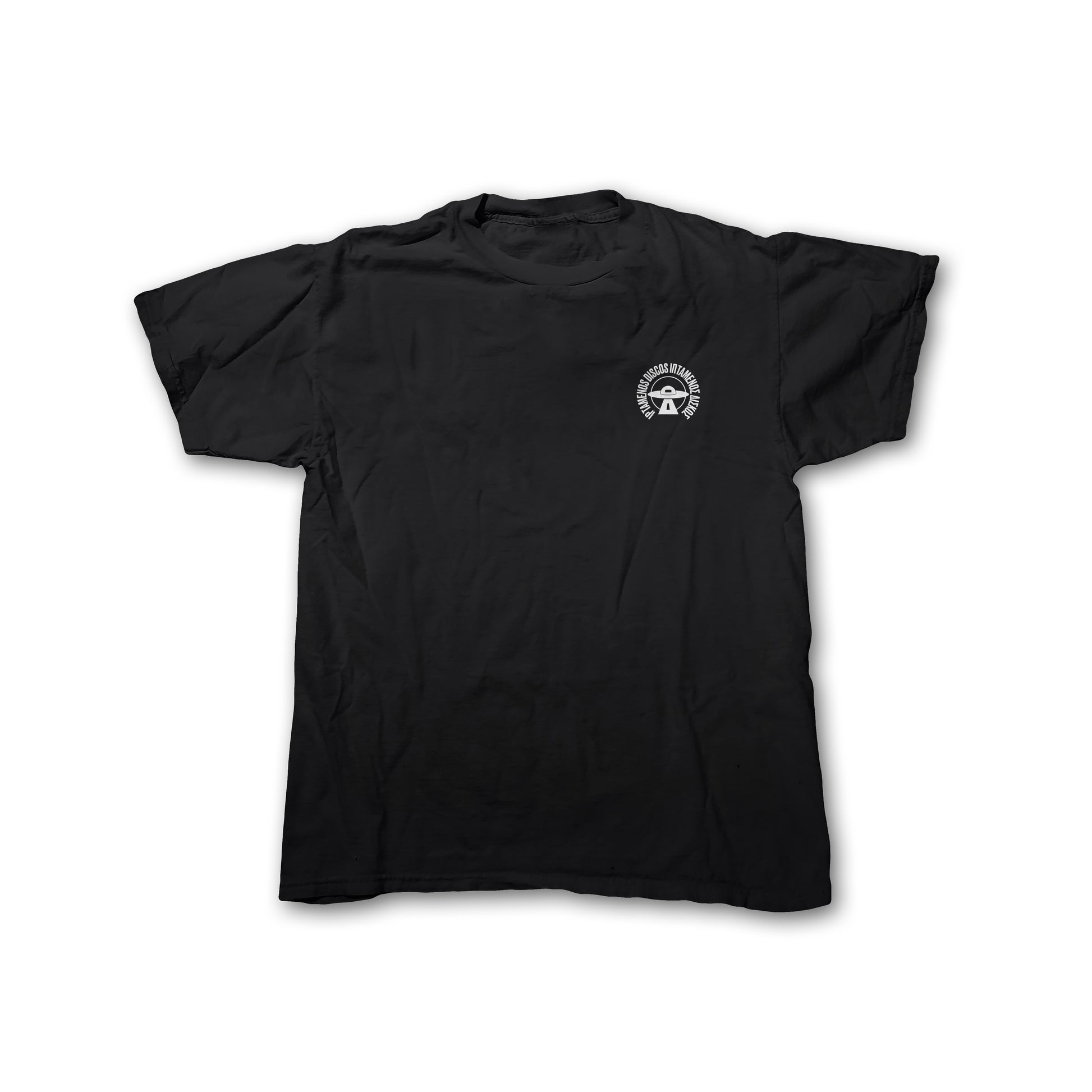 White print on black Gildan T-shirt available in various sizes. Designed by Benedikt Demmer at Druckwelle Design.